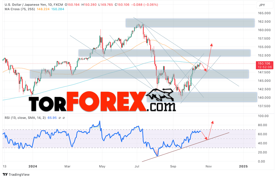 Котировки валютной пары Доллар Иена USDJPY завершает торговую неделю в рамках роста и нисходящего канала. В момент публикации прогноза курс Доллара США к Японской Иене составляет 150.10. Скользящие средние указывают на наличие краткосрочной медвежьей тенденции по паре. Цены тестируют область между сигнальными линиями, что указывает на давление со стороны продавцов Доллара США и потенциальное продолжение падения цен уже с текущих уровней. В рамках прогноза курса Японской Иены на 18 октября 2024 стоит ожидать попытку развития снижения цены и тест области поддержки вблизи уровня 147.55. Далее, отскок цены вверх и продолжение роста пары USD/JPY в область выше уровня 155.25.