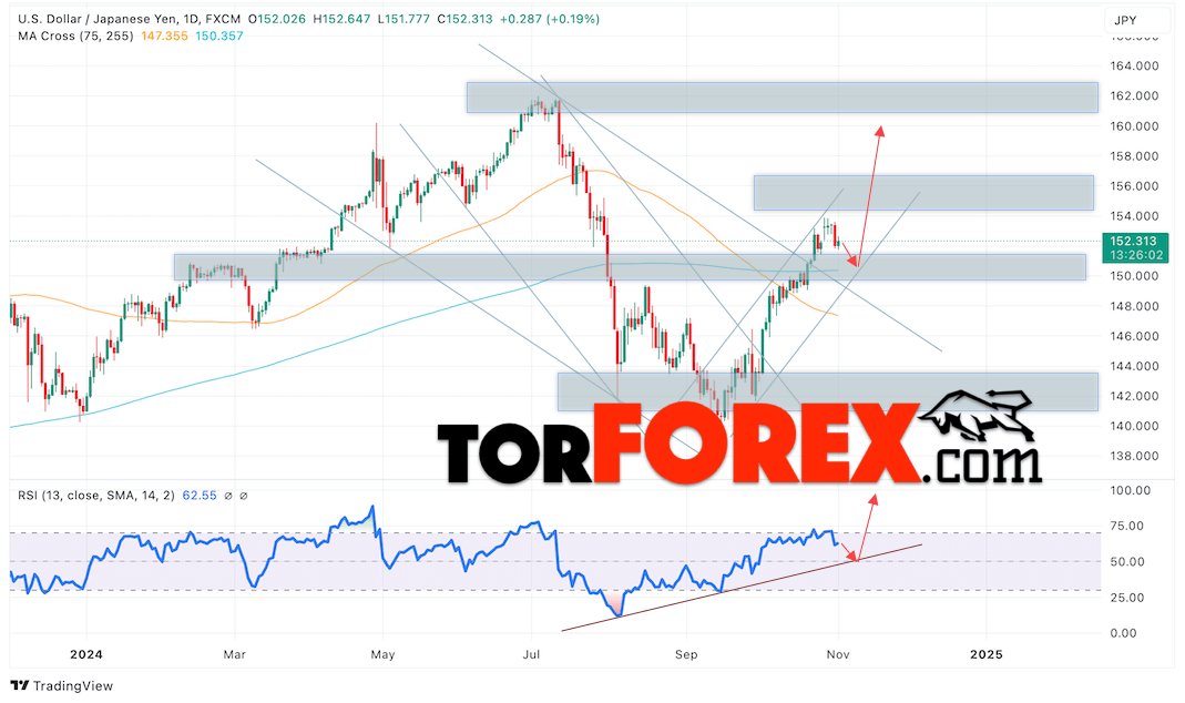 Котировки валютной пары Доллар Иена USDJPY завершает торговую неделю в рамках незначительной коррекции и бычьего канала. В момент публикации прогноза курс Доллара США к Японской Иене составляет 152.31. Скользящие средние указывают на наличие краткосрочной медвежьей тенденции по паре. Цены тестируют область между сигнальными линиями, что указывает на давление со стороны продавцов Доллара США и потенциальное продолжение падения цен уже с текущих уровней. В рамках прогноза курса Японской Иены на 1 ноября 2024 стоит ожидать попытку развития снижения цены и тест области поддержки вблизи уровня 150.35. Далее, отскок цены вверх и продолжение роста пары USD/JPY в область выше уровня 160.05.