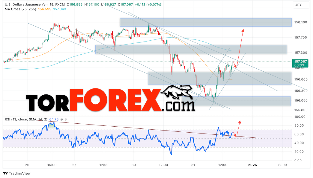Котировки валютной пары Доллар Иена USDJPY продолжают движение в рамках развития роста и покинули пределы нисходящего канала. В момент публикации прогноза курс Доллара США к Японской Иене составляет 157.06. Скользящие средние указывают на наличие краткосрочной медвежьей тенденции по паре. Цены вновь тестируют область между сигнальными линиями, что указывает на давление со стороны продавцов Доллара США и потенциальное продолжение падения цен уже с текущих уровней. В рамках прогноза курса Японской Иены на 1 января 2025 стоит ожидать попытку развития снижения цены и тест области поддержки вблизи уровня 156.65. Далее, отскок цены вверх и продолжение роста пары USD/JPY в область выше уровня 158.35.