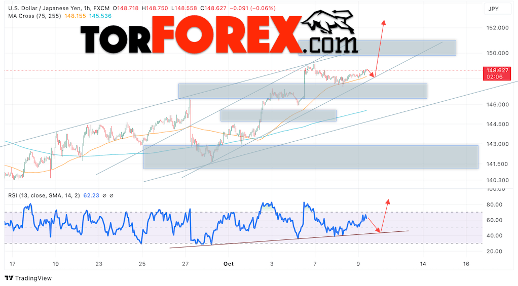 Котировки валютной пары Доллар Иена USDJPY продолжают движение в рамках развития коррекции и бычьего канала. В момент публикации прогноза курс Доллара США к Японской Иене составляет 148.62. Скользящие средние указывают на наличие краткосрочной бычьей тенденции по паре. Цены пробили область между сигнальными линиями вверх, что указывает на давление со стороны покупателей Доллара США и потенциальное продолжение роста цен уже с текущих уровней. В рамках прогноза курса Японской Иены на 10 октября 2024 стоит ожидать попытку развития снижения цены и тест области поддержки вблизи уровня 148.45. Далее, отскок цены вверх и продолжение роста пары USD/JPY в область выше уровня 152.35.