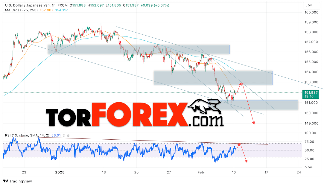 Котировки валютной пары Доллар Иена USDJPY продолжают движение в рамках развития бычьей коррекции и нисходящего канала. В момент публикации прогноза курс Доллара США к Японской Иене составляет 151.98. Скользящие средние указывают на наличие краткосрочной медвежьей тенденции по паре. Цены пробили область между сигнальными линиями вниз, что указывает на давление со стороны покупателей Доллара США и потенциальное продолжение роста цен уже с текущих уровней. В рамках прогноза курса Японской Иены на 11 февраля 2025 стоит ожидать попытку развития бычьей коррекции цены и тест области сопротивления вблизи уровня 152.85. Далее, отскок цены вниз и продолжение падения пары USD/JPY в область ниже уровня 149.05.