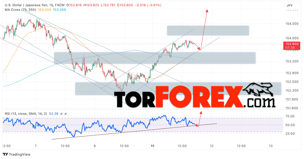 Котировки валютной пары Доллар Иена USDJPY продолжают движение в рамках развития коррекции и бычьего канала. В момент публикации прогноза курс Доллара США к Японской Иене составляет 153.80. Скользящие средние указывают на наличие краткосрочной бычьей тенденции по паре. Цены пробили область между сигнальными линиями вверх, что указывает на давление со стороны покупателей Доллара США и потенциальное продолжение роста цен уже с текущих уровней. В рамках прогноза курса Японской Иены на 12 ноября 2024 стоит ожидать попытку развития снижения цены и тест области поддержки вблизи уровня 153.55. Далее, отскок цены вверх и продолжение роста пары USD/JPY в область выше уровня 155.65.