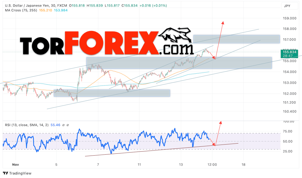 Котировки валютной пары Доллар Иена USDJPY продолжают движение в рамках развития восходящего импульса и бычьего канала. В момент публикации прогноза курс Доллара США к Японской Иене составляет 155.83. Скользящие средние указывают на наличие краткосрочной бычьей тенденции по паре. Цены пробили область между сигнальными линиями вверх, что указывает на давление со стороны покупателей Доллара США и потенциальное продолжение роста цен уже с текущих уровней. В рамках прогноза курса Японской Иены на 15 ноября 2024 стоит ожидать попытку развития снижения цены и тест области поддержки вблизи уровня 155.05. Далее, отскок цены вверх и продолжение роста пары USD/JPY в область выше уровня 158.25.