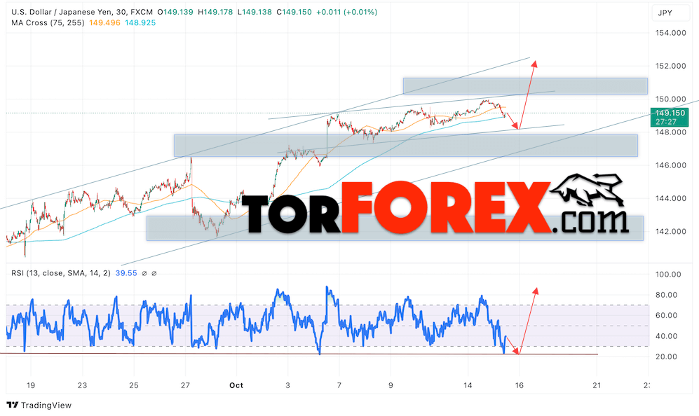 Дополнительным сигналом в пользу роста валютной пары USD/JPY выступит тест бычьей линии тренда на индикаторе относительной силы. Вторым сигналом станет отскок от нижней границы восходящего канала. Отменой варианта подъёма валютной пары Доллар Иена станет падение и пробой уровня 147.65. Это укажет на пробой области поддержки и продолжение снижения валютной пары Доллар Иена. В этом случае стоит ожидать продолжения падения пары в область ниже отметки 145.35. Ожидать подтверждения росту цены стоит с пробоем уровня сопротивления и закреплением цены выше уровня 151.45, что укажет на пробой верхней границы бычьего канала, а это сигнал для роста на ширину канала.
