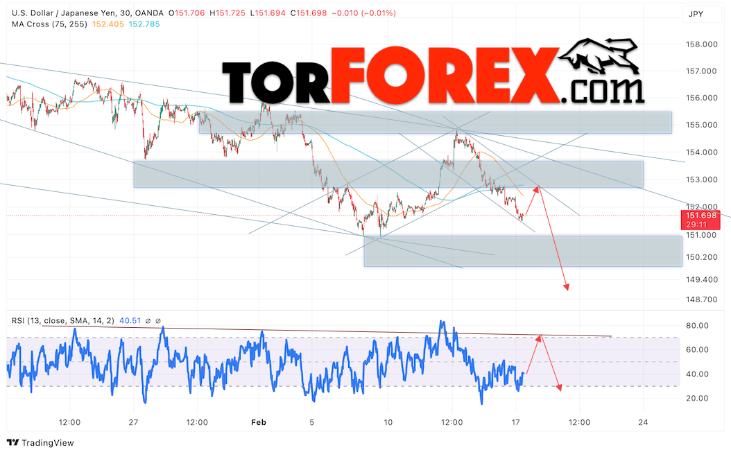 Котировки валютной пары Доллар Иена USDJPY продолжают движение в рамках развития падения и нисходящего канала. В момент публикации прогноза курс Доллара США к Японской Иене составляет 151.69. Скользящие средние указывают на наличие краткосрочной медвежьей тенденции по паре. Цены пробили область между сигнальными линиями вниз, что указывает на давление со стороны продавцов Доллара США и потенциальное продолжение падения цен уже с текущих уровней. В рамках прогноза курса Японской Иены на 18 февраля 2025 стоит ожидать попытку развития бычьей коррекции цены и тест области сопротивления вблизи уровня 152.65. Далее, отскок цены вниз и продолжение падения пары USD/JPY в область ниже уровня 149.05.