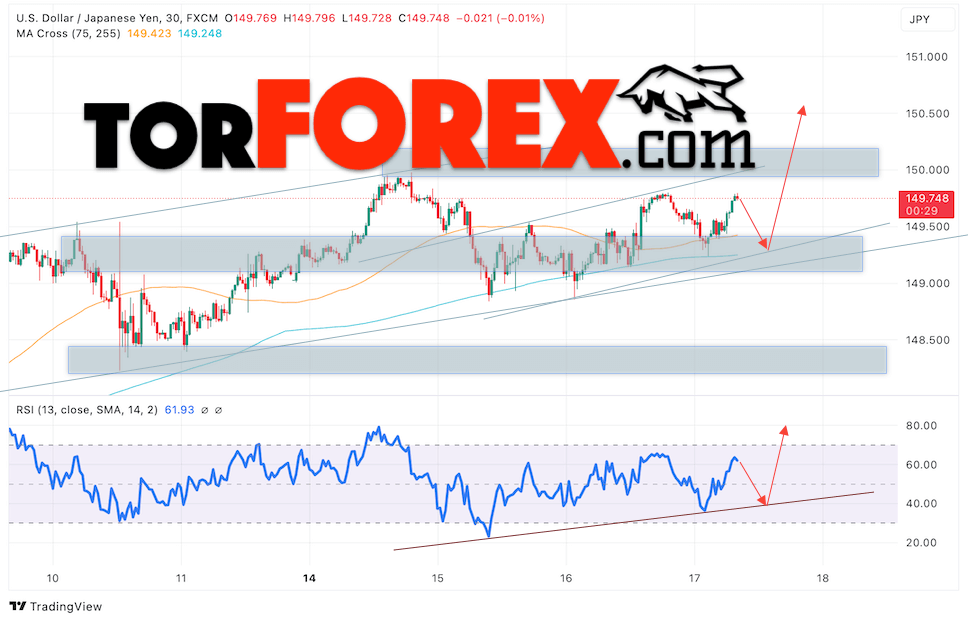 Дополнительным сигналом в пользу роста валютной пары USD/JPY выступит тест бычьей линии тренда на индикаторе относительной силы. Вторым сигналом станет отскок от нижней границы восходящего канала. Отменой варианта подъёма валютной пары Доллар Иена станет падение и пробой уровня 148.75. Это укажет на пробой области поддержки и продолжение снижения валютной пары Доллар Иена. В этом случае стоит ожидать продолжения падения пары в область ниже отметки 146.35. Ожидать подтверждения росту цены стоит с пробоем уровня сопротивления и закреплением цены выше уровня 150.65, что укажет на пробой верхней границы бычьего канала, а это сигнал для роста на ширину канала.