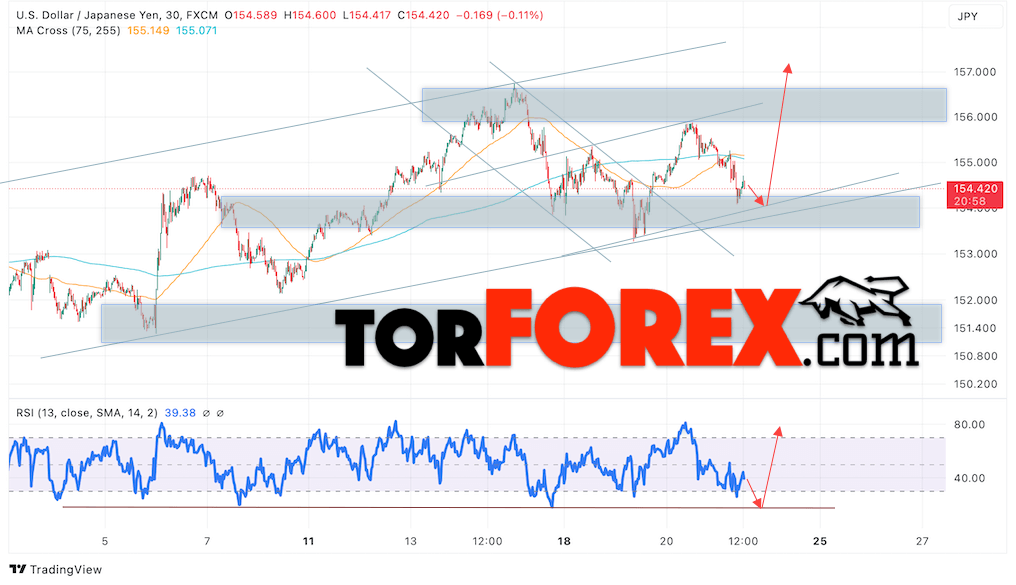 Дополнительным сигналом в пользу роста валютной пары USD/JPY выступит тест линии пробитой линии тренда на индикаторе относительной силы. Вторым сигналом станет отскок от нижней границы бычьего канала. Отменой варианта подъёма валютной пары Доллар Иена станет падение и пробой уровня 153.65. Это укажет на пробой области поддержки и продолжение падения валютной пары Доллар Иена. В этом случае стоит ожидать продолжения снижения пары в область ниже отметки 151.85. Ожидать подтверждения росту цены стоит с пробоем уровня сопротивления и закреплением цены выше уровня 155.05.