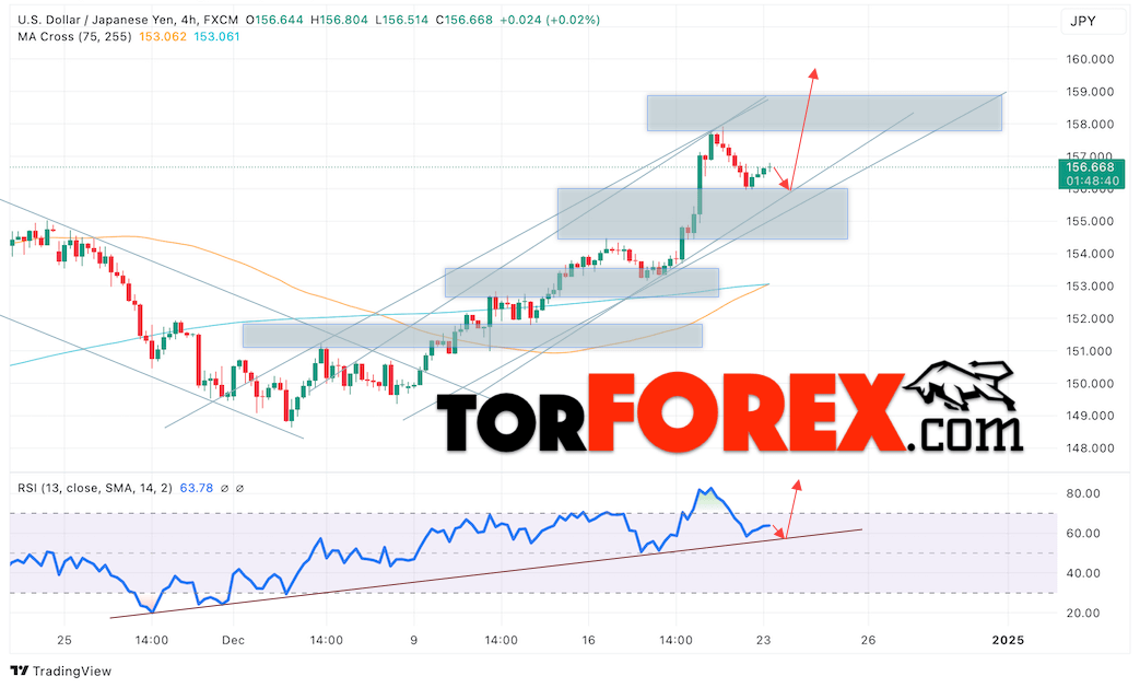 Котировки валютной пары Доллар Иена USDJPY продолжают движение в рамках развития боковой коррекции и восходящего канала. В момент публикации прогноза курс Доллара США к Японской Иене составляет 156.66. Скользящие средние указывают на наличие краткосрочной бычьей тенденции по паре. Цены пробили область между сигнальными линиями вверх, что указывает на давление со стороны покупателей Доллара США и потенциальное продолжение роста цен уже с текущих уровней. В рамках прогноза курса Японской Иены на 24 декабря 2024 стоит ожидать попытку развития снижения цены и тест области поддержки вблизи уровня 156.15. Далее, отскок цены вверх и продолжение роста пары USD/JPY в область выше уровня 160.05.
