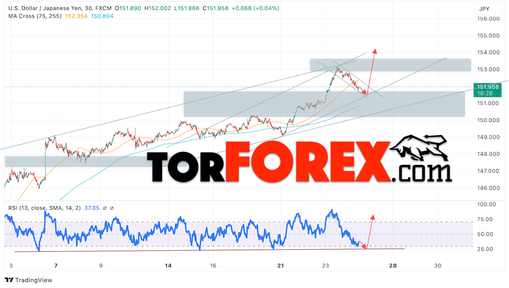 Котировки валютной пары Доллар Иена USDJPY продолжают движение в рамках развития агрессивного роста и бычьего канала. В момент публикации прогноза курс Доллара США к Японской Иене составляет 151.95. Скользящие средние указывают на наличие краткосрочной бычьей тенденции по паре. Цены пробили область между сигнальными линиями вверх, что указывает на давление со стороны покупателей Доллара США и потенциальное продолжение роста цен уже с текущих уровней. В рамках прогноза курса Японской Иены на 25 октября 2024 стоит ожидать попытку развития снижения цены и тест области поддержки вблизи уровня 151.65. Далее, отскок цены вверх и продолжение роста пары USD/JPY в область выше уровня 154.05.