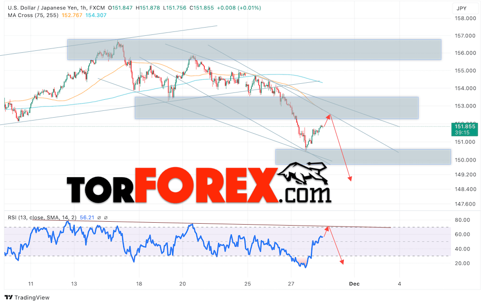 Котировки валютной пары Доллар Иена USDJPY продолжают движение в рамках развития бычьей коррекции и нисходящего канала. В момент публикации прогноза курс Доллара США к Японской Иене составляет 151.85. Скользящие средние указывают на наличие краткосрочной медвежьей тенденции по паре. Цены пробили область между сигнальными линиями вниз, что указывает на давление со стороны продавцов Доллара США и потенциальное продолжение падения цен уже с текущих уровней. В рамках прогноза курса Японской Иены на 29 ноября 2024 стоит ожидать попытку развития роста цены и тест области сопротивления вблизи уровня 152.25. Далее, отскок цены вниз и продолжение падения пары USD/JPY в область ниже уровня 149.15.