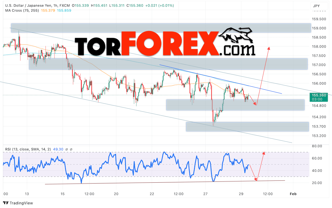 Котировки валютной пары Доллар Иена USDJPY продолжают движение в рамках развития коррекции и формирования разворотной модели «Голова и плечи». В момент публикации прогноза курс Доллара США к Японской Иене составляет 155.36. Скользящие средние указывают на наличие краткосрочной бычьей тенденции по паре. Цены тестируют область между сигнальными линиями, что указывает на давление со стороны покупателей Доллара США и потенциальное продолжение роста цен уже с текущих уровней. В рамках прогноза курса Японской Иены на 30 января 2025 стоит ожидать попытку развития падения цены и тест области поддержки вблизи уровня 154.85. Далее, отскок цены вверх и продолжение роста пары USD/JPY в область выше уровня 157.85.