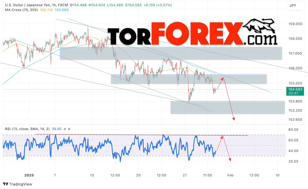 Котировки валютной пары Доллар Иена USDJPY продолжают движение в рамках развития падения и нисходящего канала. В момент публикации прогноза курс Доллара США к Японской Иене составляет 154.59. Скользящие средние указывают на наличие краткосрочной медвежьей тенденции по паре. Цены тестируют область между сигнальными линиями, что указывает на давление со стороны покупателей Доллара США и потенциальное продолжение роста цен уже с текущих уровней. В рамках прогноза курса Японской Иены на 31 января 2025 стоит ожидать попытку развития роста цены и тест области сопротивления вблизи уровня 155.15. Далее, отскок цены вниз и продолжение падения пары USD/JPY в область ниже уровня 152.65.