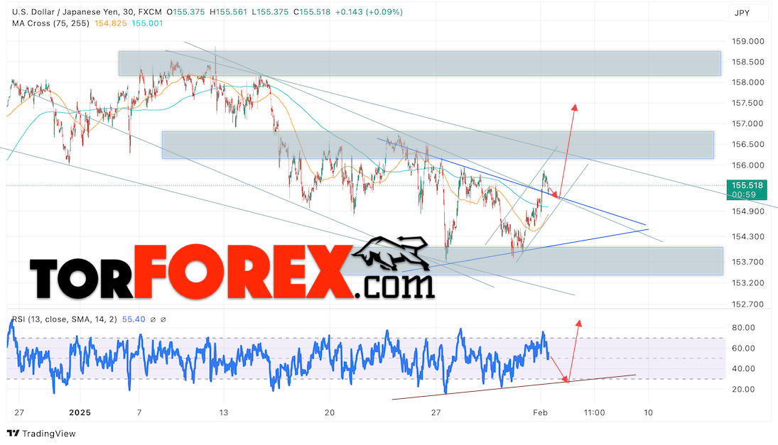 Котировки валютной пары Доллар Иена USDJPY продолжают движение в рамках развития роста и начала отработки модели «Треугольник». В момент публикации прогноза курс Доллара США к Японской Иене составляет 155.51. Скользящие средние указывают на наличие краткосрочной медвежьей тенденции по паре. Цены пробили область между сигнальными линиями вверх, что указывает на давление со стороны покупателей Доллара США и потенциальное продолжение роста цен уже с текущих уровней. В рамках прогноза курса Японской Иены на 4 февраля 2025 стоит ожидать попытку развития медвежьей коррекции цены и тест области поддержки вблизи уровня 154.85. Далее, отскок цены вверх и продолжение роста пары USD/JPY в область выше уровня 157.55.