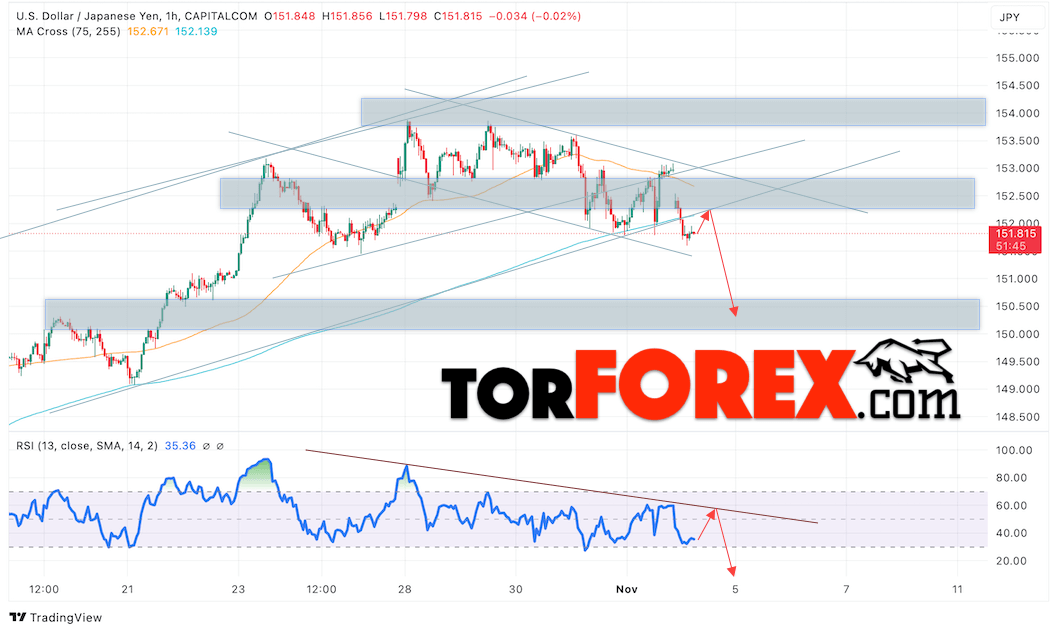 Котировки валютной пары Доллар Иена USDJPY продолжают движение в рамках развития падения и покинул пределы бычьего канала коррекции. В момент публикации прогноза курс Доллара США к Японской Иене составляет 152.16. Скользящие средние указывают на наличие краткосрочной бычьей тенденции по паре. Цены пробили область между сигнальными линиями вниз, что указывает на давление со стороны продавцов Доллара США и потенциальное продолжение падения цен уже с текущих уровней. В рамках прогноза курса Японской Иены на 5 ноября 2024 стоит ожидать попытку развития роста цены и тест области сопротивления вблизи уровня 152.15. Далее, отскок цены вниз и продолжение падения пары USD/JPY в область ниже уровня 150.35.