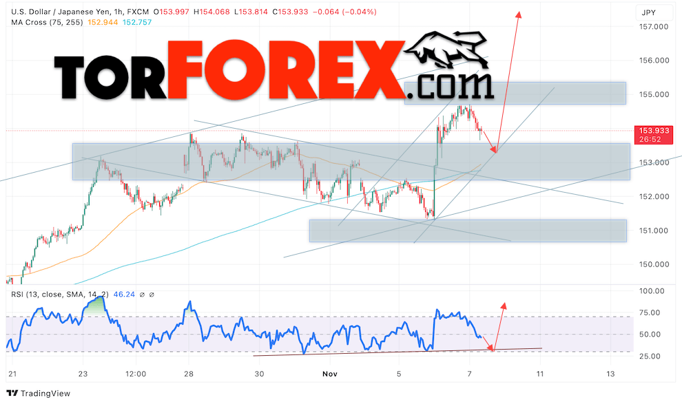 Котировки валютной пары Доллар Иена USDJPY продолжают движение в рамках развития медвежьей коррекции и бычьего канала. В момент публикации прогноза курс Доллара США к Японской Иене составляет 153.93. Скользящие средние указывают на наличие краткосрочной бычьей тенденции по паре. Цены пробили область между сигнальными линиями вверх, что указывает на давление со стороны покупателей Доллара США и потенциальное продолжение роста цен уже с текущих уровней. В рамках прогноза курса Японской Иены на 8 ноября 2024 стоит ожидать попытку развития снижения цены и тест области поддержки вблизи уровня 153.15. Далее, отскок цены вверх и продолжение роста пары USD/JPY в область выше уровня 157.45.