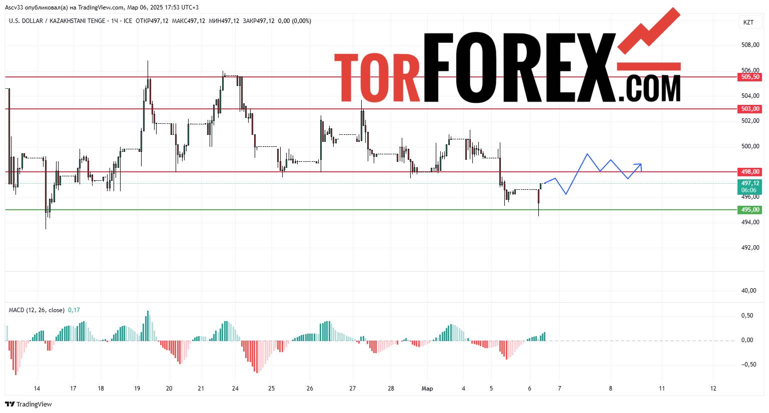 Текущая техническая картина указывает на возможность движения в пределах 495,00–503,00. Если курс преодолеет 503,00, ожидается продолжение роста, тогда как пробой 495,00 может стать сигналом к снижению в сторону 490,00.