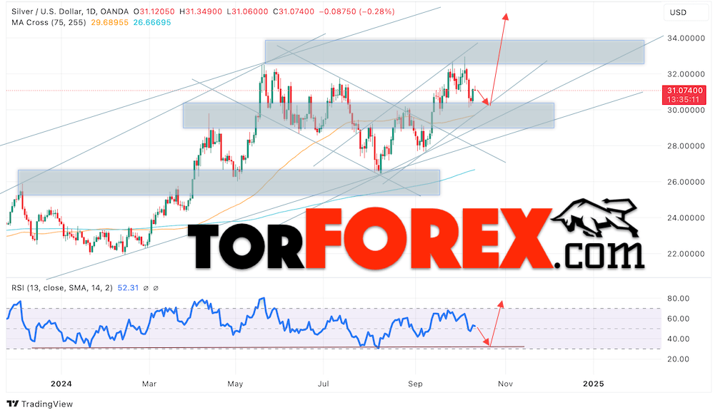 Дополнительным сигналом в пользу подъёма котировок и цен на Серебро XAGUSD выступит тест линии поддержки на индикаторе относительной силы (RSI). Вторым сигналом в пользу роста станет отскок от нижней границы бычьего канала. Отменой варианта роста цен на Серебро 14 — 18 октября 2024 станет падения и пробой 28.75. Это укажет на пробой области поддержки и продолжение падения в область ниже уровня 26.75. Ожидать подтверждения роста котировок XAGUSD стоит с пробоем области сопротивления и закрытием цены над уровнем 32.75.