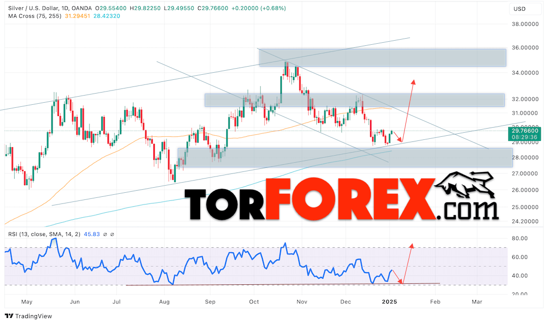 Дополнительным сигналом в пользу подъёма котировок и цен на Серебро XAGUSD выступит тест линии бычьей линии тренда на индикаторе относительной силы (RSI). Вторым сигналом в пользу роста станет отскок от нижней границы бычьего канала. Отменой варианта подъёма цен на Серебро 6 — 10 января 2025 станет падение и пробой 27.65. Это укажет на пробой области сопротивления и продолжение роста в область выше уровня 24.75. Ожидать подтверждения росту котировок XAGUSD стоит с пробоем области сопротивления и закрытием цены над уровнем 31.35, что укажет на пробой верхней границы нисходящего канала коррекции.