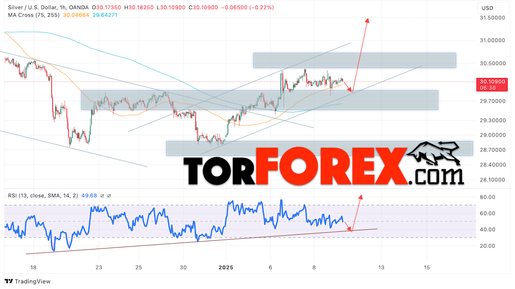 Дополнительным сигналом в пользу роста котировок и цен на Серебро XAG/USD выступит тест линии поддержки на индикаторе относительной силы (RSI). Вторым сигналом в пользу роста станет отскок от нижней границы бычьего канала. Отменой варианта подъёма цен на Серебро 10 января 2025 станет падение и пробой 29.55. Это укажет на пробой области поддержки и продолжение падения в область ниже уровня 27.65. Ожидать ускорения роста котировок XAGUSD стоит с пробоем области сопротивления и закрытием цены над уровнем 30.65.