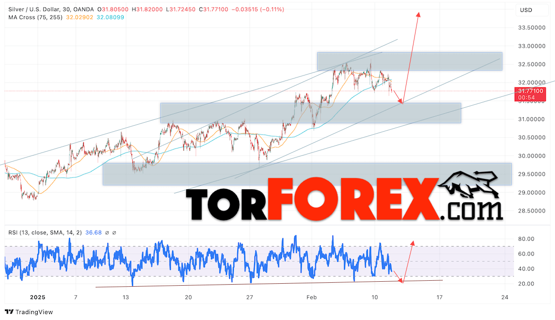 Дополнительным сигналом в пользу подъёма котировок и цен на Серебро XAG/USD выступит тест линии поддержки на индикаторе относительной силы (RSI). Вторым сигналом в пользу роста станет отскок от нижней границы бычьего канала. Отменой варианта подъёма цен на Серебро 12 февраля 2025 станет падение и пробой 31.25. Это укажет на пробой области поддержки и продолжение падения в область ниже уровня 29.65. Ожидать ускорения роста котировок XAGUSD стоит с пробоем области сопротивления и закрытием цены над уровнем 32.65.