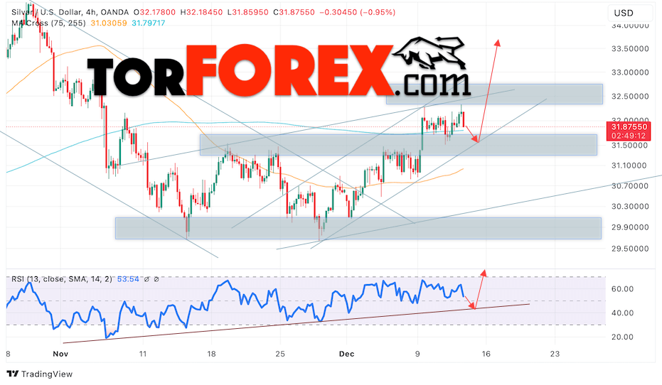 Дополнительным сигналом в пользу подъёма котировок и цен на Серебро XAG/USD выступит тест линии поддержки на индикаторе относительной силы (RSI). Вторым сигналом в пользу подъёма станет отскок от нижней границы бычьего канала. Отменой варианта роста цен на Серебро 13 декабря 2024 станет падение и пробой 31.15. Это укажет на пробой области поддержки и продолжение падения в область ниже уровня 29.75. Ожидать ускорения роста котировок XAGUSD стоит с пробоем области сопротивления и закрытием цены над уровнем 32.65.