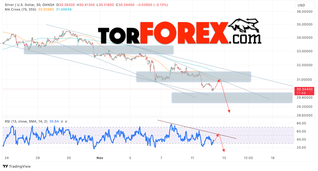 Дополнительным сигналом в пользу снижения котировок и цен на Серебро XAG/USD выступит тест линии сопротивления на индикаторе относительной силы (RSI). Вторым сигналом в пользу падения станет отскок от верхней границы нисходящего канала. Отменой варианта падения цен на Серебро 13 ноября 2024 станет сильный рост и пробой 31.35. Это укажет на пробой области сопротивления и продолжение роста в область выше уровня 32.65. Ожидать ускорения падения котировок XAGUSD стоит с пробоем области поддержки и закрытием цены под уровнем 29.75.