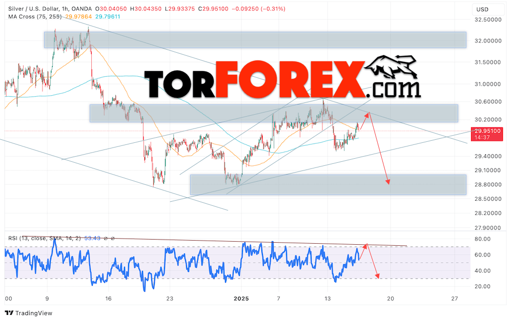 Дополнительным сигналом в пользу падения котировок и цен на Серебро XAG/USD выступит тест линии сопротивления на индикаторе относительной силы (RSI). Вторым сигналом в пользу роста станет отскок от верхней границы медвежьего канала. Отменой варианта падения цен на Серебро 16 января 2025 станет сильный рост и пробой 30.85. Это укажет на пробой области сопротивления и продолжение роста в область выше уровня 32.65. Ожидать ускорения падения котировок XAGUSD стоит с пробоем области поддержки и закрытием цены под уровнем 29.05, что укажет на пробой нижней границы бычьего канала коррекции.