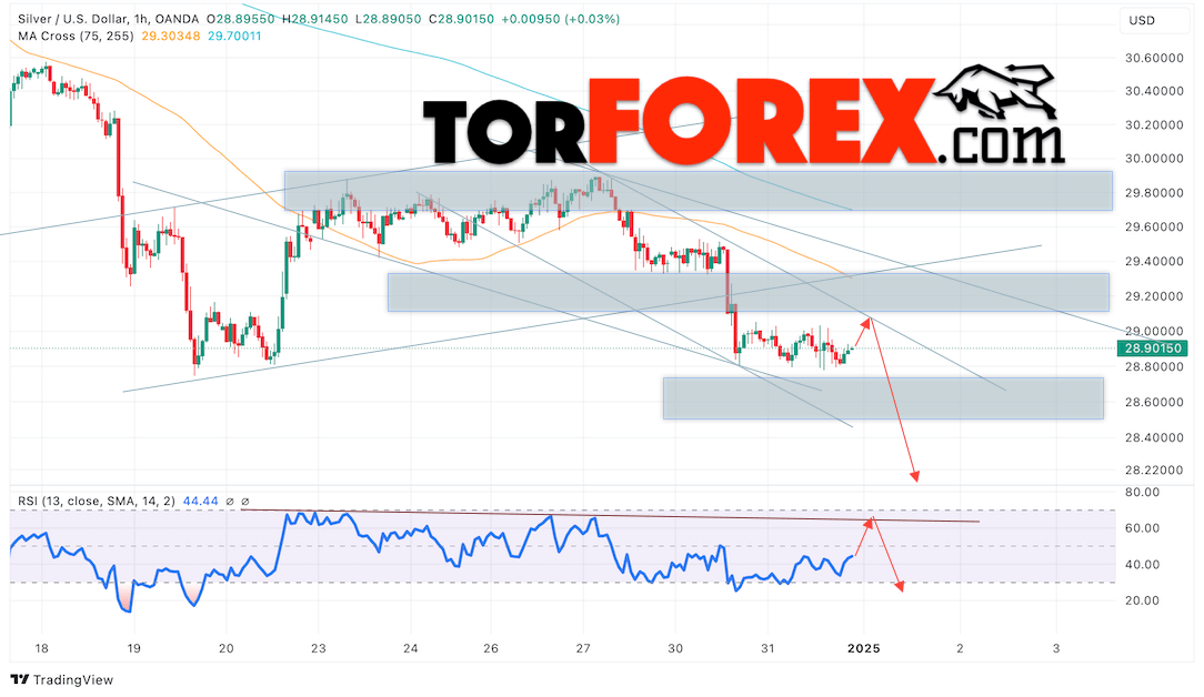 Дополнительным сигналом в пользу падения котировок и цен на Серебро XAG/USD выступит тест линии сопротивления на индикаторе относительной силы (RSI). Вторым сигналом в пользу снижения станет отскок от верхней границы медвежьего канала. Отменой варианта падения цен на Серебро 2 января 2025 станет сильный рост и пробой 29.75. Это укажет на пробой области сопротивления и продолжение роста в область выше уровня 31.55. Ожидать ускорения падения котировок XAGUSD стоит с пробоем области поддержки и закрытием цены под уровнем 28.65.