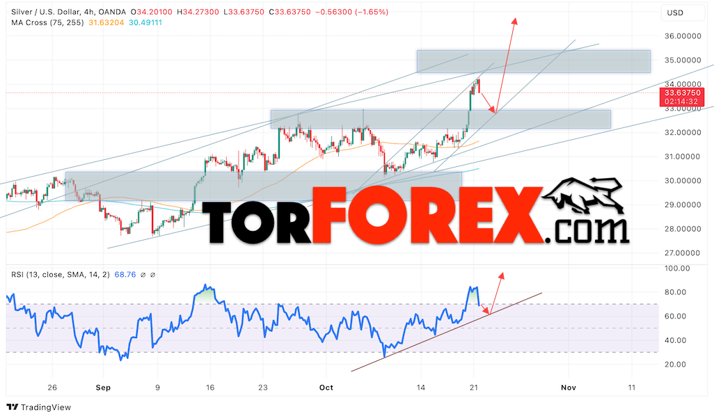 Дополнительным сигналом в пользу роста котировок и цен на Серебро XAG/USD выступит тест линии поддержки на индикаторе относительной силы (RSI). Вторым сигналом в пользу роста станет отскок от верхней границы медвежьего канала. Отменой варианта подъёма цен на Серебро 22 октября 2024 станет падение и пробой 31.85. Это укажет на пробой области поддержки и продолжение падения в область ниже уровня 30.05. Ожидать ускорения роста котировок XAGUSD стоит с пробоем области сопротивления и закрытием цены над уровнем 35.45, что укажет на пробой верхней границы бычьего канала.