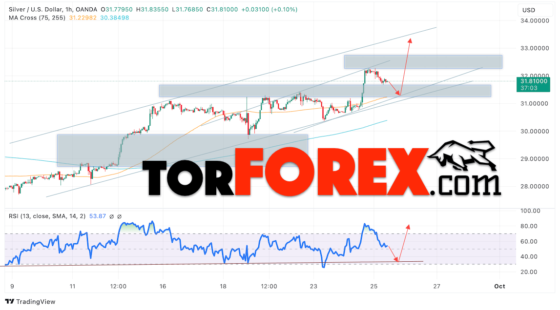 Дополнительным сигналом в пользу подъёма котировок и цен на Серебро XAG/USD выступит тест линии поддержки на индикаторе относительной силы (RSI). Вторым сигналом в пользу роста станет отскок от нижней границы бычьего канала. Отменой варианта роста цен на Серебро 26 сентября 2024 станет падения и пробой 30.65. Это укажет на пробой области поддержки и продолжение падения в область ниде уровня 28.75. Ожидать ускорения роста котировок XAGUSD стоит с пробоем области сопротивления и закрытием цены над уровнем 32.25.