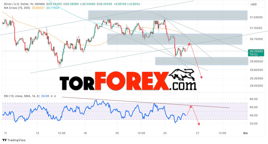 Дополнительным сигналом в пользу снижения котировок и цен на Серебро XAG/USD выступит тест линии сопротивления на индикаторе относительной силы (RSI). Вторым сигналом в пользу падения станет отскок от нижней границы бычьего канала. Отменой варианта снижения цен на Серебро 27 ноября 2024 станет сильный рост и пробой 30.85. Это укажет на пробой области сопротивления и продолжение роста в область выше уровня 32.15. Ожидать ускорения падения котировок XAGUSD стоит с пробоем области поддержки и закрытием цены под уровнем 29.85.