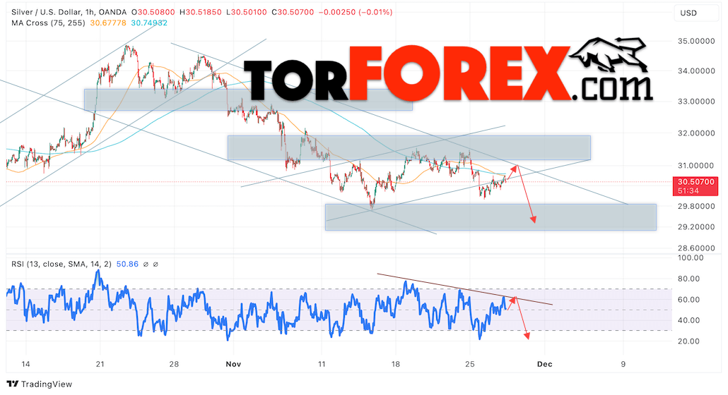 Дополнительным сигналом в пользу снижения котировок и цен на Серебро XAG/USD выступит тест линии сопротивления на индикаторе относительной силы (RSI). Вторым сигналом в пользу падения станет отскок от верхней границы нисходящего канала. Отменой варианта снижения цен на Серебро 28 ноября 2024 станет сильный рост и пробой 31.45. Это укажет на пробой области сопротивления и продолжение роста в область выше уровня 32.75. Ожидать ускорения падения котировок XAGUSD стоит с пробоем области поддержки и закрытием цены под уровнем 29.75.