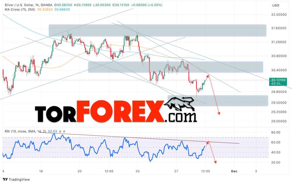 Дополнительным сигналом в пользу снижения котировок и цен на Серебро XAG/USD выступит тест линии сопротивления на индикаторе относительной силы (RSI). Вторым сигналом в пользу падения станет отскок от верхней границы нисходящего канала. Отменой варианта снижения цен на Серебро 29 ноября 2024 станет сильный рост и пробой 30.95. Это укажет на пробой области сопротивления и продолжение роста в область выше уровня 32.45. Ожидать ускорения падения котировок XAGUSD стоит с пробоем области поддержки и закрытием цены под уровнем 29.45.