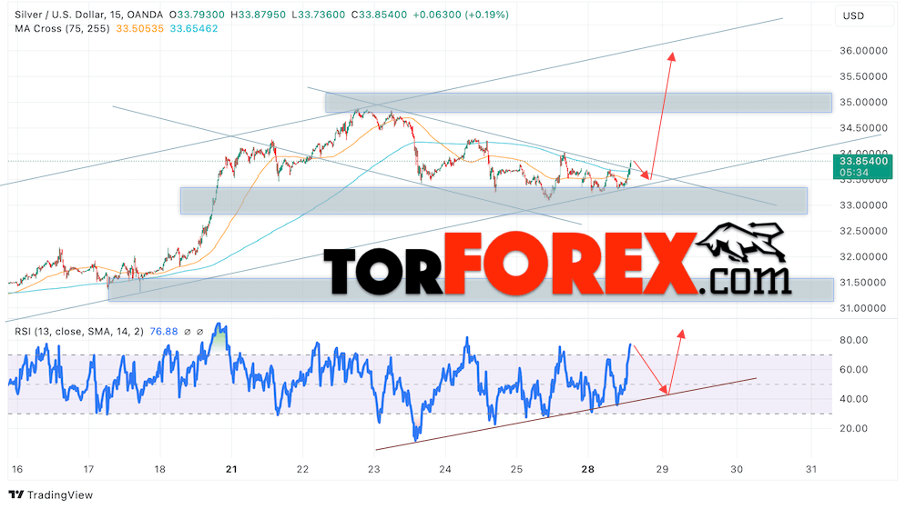 Дополнительным сигналом в пользу роста котировок и цен на Серебро XAG/USD выступит тест линии поддержки на индикаторе относительной силы (RSI). Вторым сигналом в пользу роста станет отскок от нижней границы бычьего канала. Отменой варианта подъёма цен на Серебро 29 октября 2024 станет падение и пробой 32.95. Это укажет на пробой области поддержки и продолжение падения в область ниже уровня 31.65. Ожидать ускорения роста котировок XAGUSD стоит с пробоем области сопротивления и закрытием цены над уровнем 34.45.