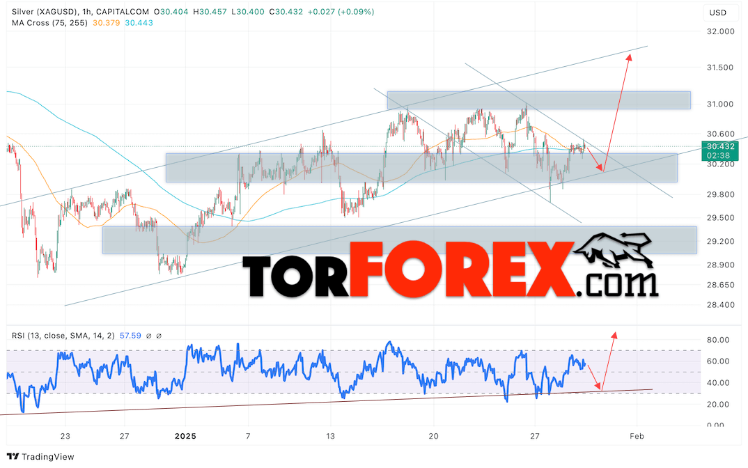 Дополнительным сигналом в пользу подъёма котировок и цен на Серебро XAG/USD выступит тест линии поддержки на индикаторе относительной силы (RSI). Вторым сигналом в пользу роста станет отскок от нижней границы бычьего канала. Отменой варианта подъёма цен на Серебро 30 января 2025 станет падение и пробой 29.75. Это укажет на пробой области поддержки и продолжение падения в область ниже уровня 27.85. Ожидать ускорения роста котировок XAGUSD стоит с пробоем области сопротивления и закрытием цены над уровнем 30.75, что укажет на пробой верхней границы нисходящего канала коррекции.