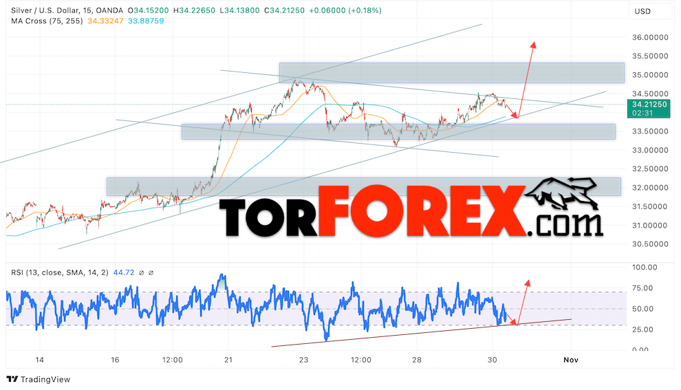 Дополнительным сигналом в пользу роста котировок и цен на Серебро XAG/USD выступит тест линии поддержки на индикаторе относительной силы (RSI). Вторым сигналом в пользу роста станет отскок от нижней границы бычьего канала. Отменой варианта подъёма цен на Серебро 31 октября 2024 станет падение и пробой 33.35. Это укажет на пробой области поддержки и продолжение падения в область ниже уровня 32.65. Ожидать ускорения роста котировок XAGUSD стоит с пробоем области сопротивления и закрытием цены над уровнем 34.65, что укажет на пробой верхней границы нисходящего канала коррекции.