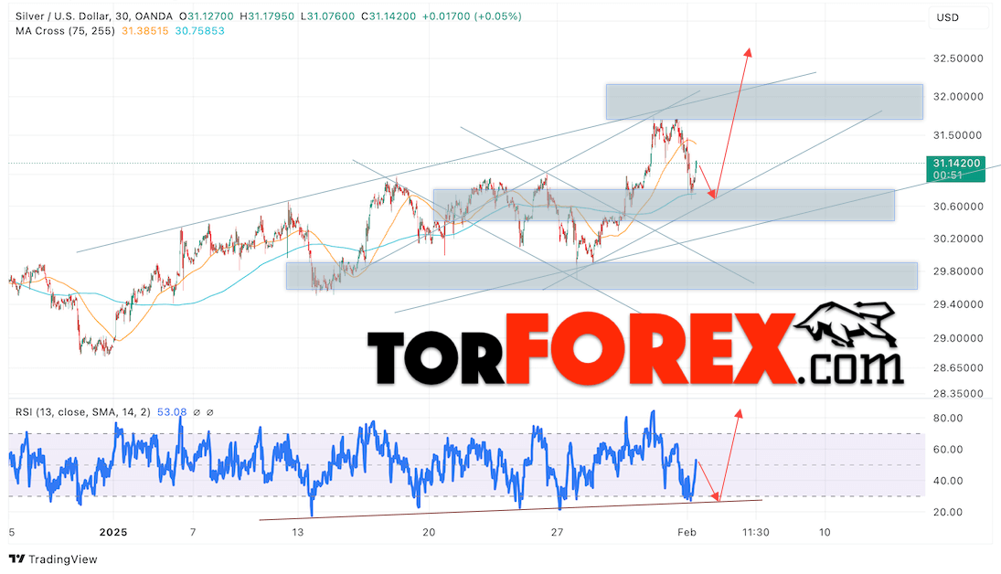Дополнительным сигналом в пользу подъёма котировок и цен на Серебро XAG/USD выступит тест линии поддержки на индикаторе относительной силы (RSI). Вторым сигналом в пользу роста станет отскок от нижней границы бычьего канала. Отменой варианта подъёма цен на Серебро 4 февраля 2025 станет падение и пробой 30.15. Это укажет на пробой области поддержки и продолжение падения в область ниже уровня 28.05. Ожидать ускорения роста котировок XAGUSD стоит с пробоем области сопротивления и закрытием цены над уровнем 31.55.