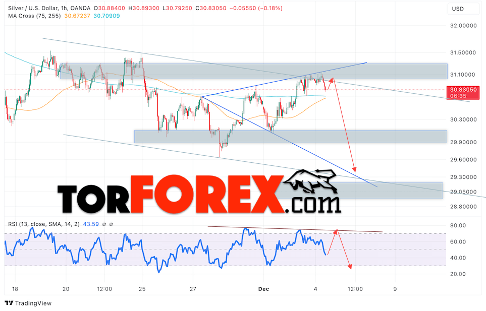 Дополнительным сигналом в пользу снижения котировок и цен на Серебро XAG/USD выступит тест линии сопротивления на индикаторе относительной силы (RSI). Вторым сигналом в пользу падения станет отскок от верхней границы модели «Волна Вульфа». Отменой варианта снижения цен на Серебро 5 декабря 2024 станет сильный рост и пробой 31.65. Это укажет на пробой области сопротивления и продолжение роста в область выше уровня 32.85. Ожидать ускорения падения котировок XAGUSD стоит с пробоем области поддержки и закрытием цены под уровнем 30.55.