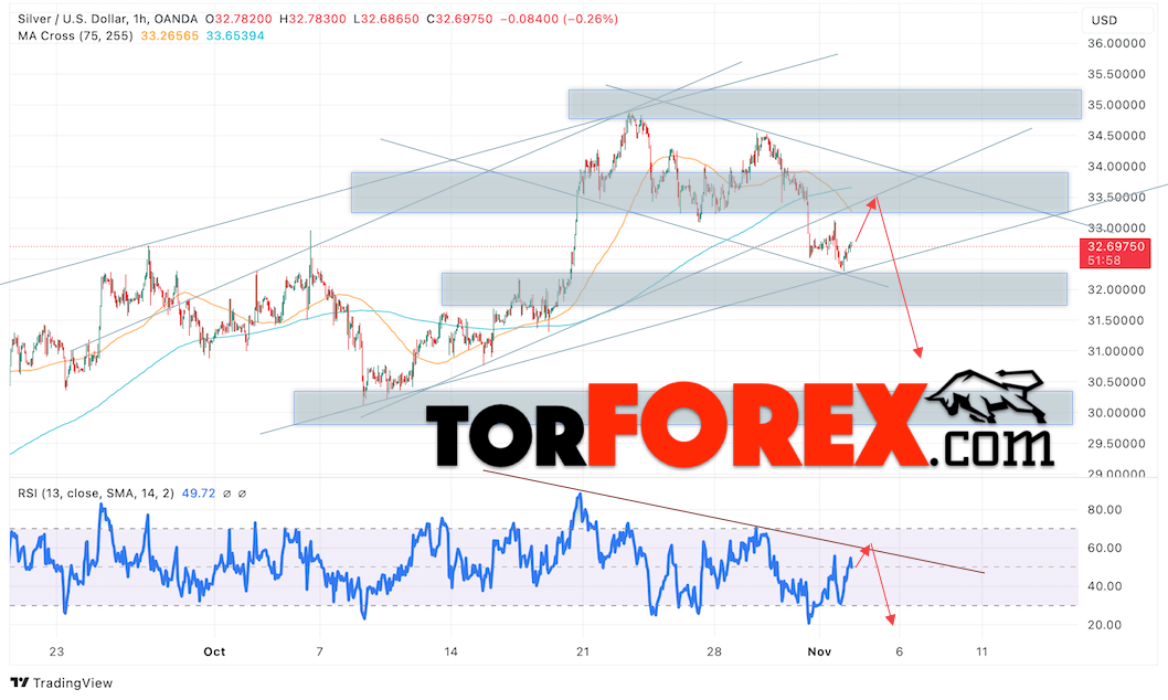 Дополнительным сигналом в пользу снижения котировок и цен на Серебро XAG/USD выступит тест линии сопротивления на индикаторе относительной силы (RSI). Вторым сигналом в пользу падения станет отскок от нижней границы бычьего канала. Отменой варианта снижения цен на Серебро 5 ноября 2024 станет сильный рост и пробой 34.35. Это укажет на пробой области сопротивления и продолжение подъёма в область выше уровня 36.55. Ожидать ускорения падения котировок XAGUSD стоит с пробоем области поддержки и закрытием цены под уровнем 32.05, что укажет на пробой нижней границы нисходящего бычьего.
