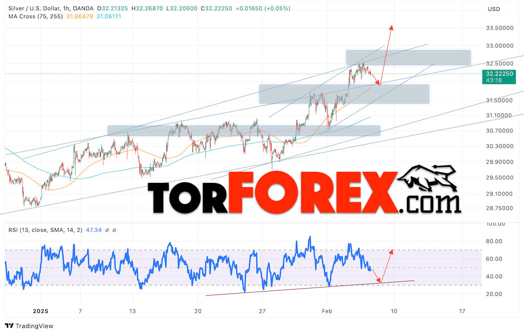 Дополнительным сигналом в пользу подъёма котировок и цен на Серебро XAG/USD выступит тест линии поддержки на индикаторе относительной силы (RSI). Вторым сигналом в пользу роста станет отскок от нижней границы бычьего канала. Отменой варианта подъёма цен на Серебро 7 февраля 2025 станет падение и пробой 31.75. Это укажет на пробой области поддержки и продолжение падения в область ниже уровня 30.45. Ожидать ускорения роста котировок XAGUSD стоит с пробоем области сопротивления и закрытием цены над уровнем 33.05, что укажет на пробой верхней границы бычьего канала.