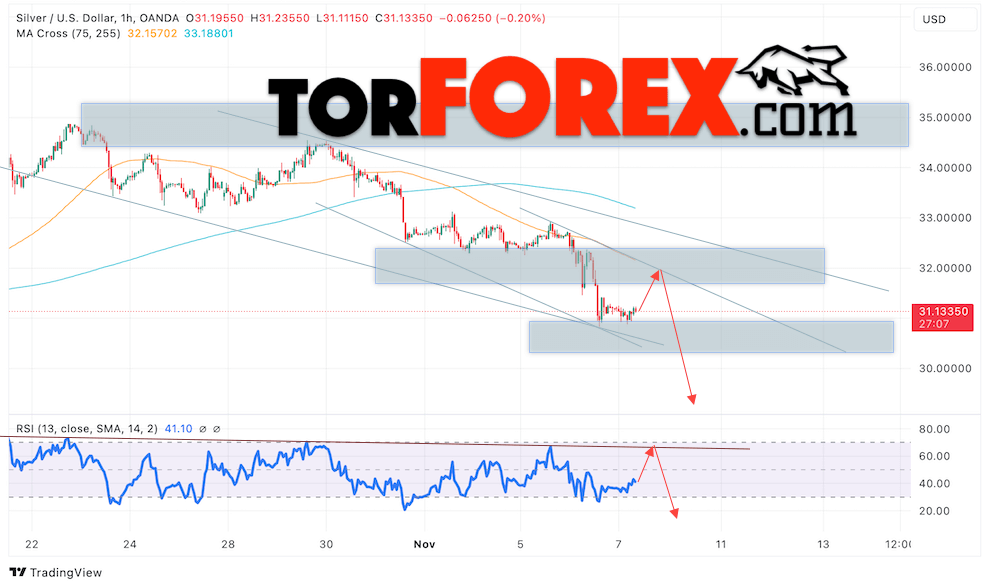 Дополнительным сигналом в пользу снижения котировок и цен на Серебро XAG/USD выступит тест линии сопротивления на индикаторе относительной силы (RSI). Вторым сигналом в пользу падения станет отскок от верхней границы нисходящего канала. Отменой варианта падения цен на Серебро 8 ноября 2024 станет сильный рост и пробой 32.65. Это укажет на пробой области сопротивления и продолжение роста в область выше уровня 33.85. Ожидать ускорения падения котировок XAGUSD стоит с пробоем области поддержки и закрытием цены под уровнем 31.45.