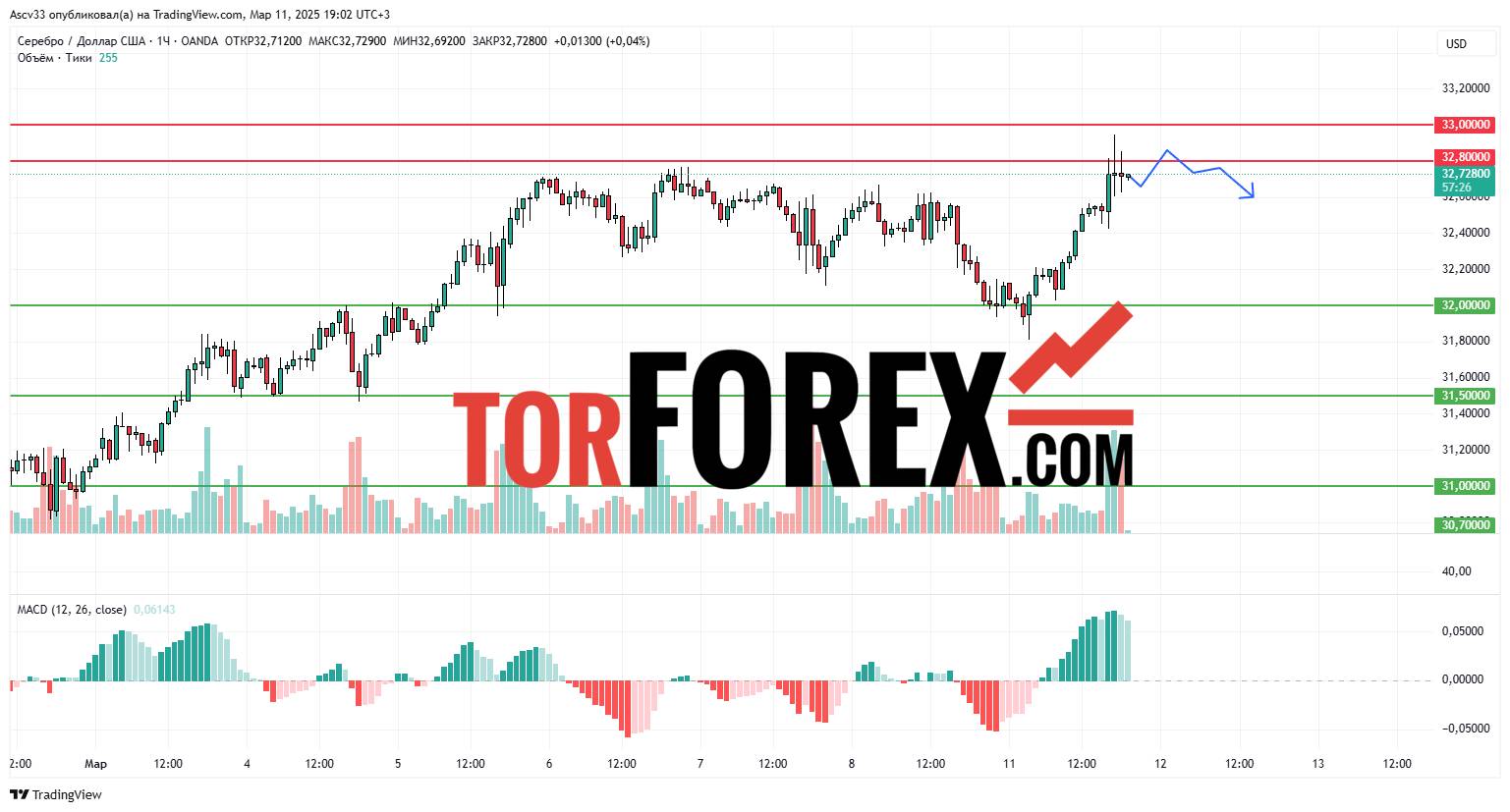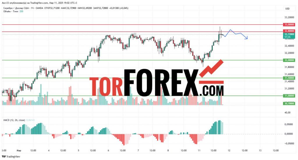 С высокой вероятностью XAG/USD останется в диапазоне $32,00–$32,80 в течение следующих суток. Если серебро преодолеет $32,80, возможен рост к $33,00. В случае закрепления ниже $32,00, давление продавцов усилится, и цена может снизиться к $31,50. Трейдерам рекомендуется следить за реакцией рынка на этих уровнях, так как их пробой определит дальнейшее направление движения металла.