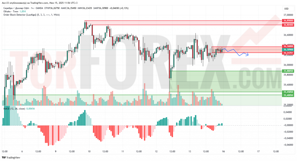 На фоне снижающихся объёмов и слабости восходящего импульса ожидается коррекция в сторону зоны 35,88–35,40. Закрепление выше 36,37 отменит этот сценарий и может привести к повторному тесту 36,80.