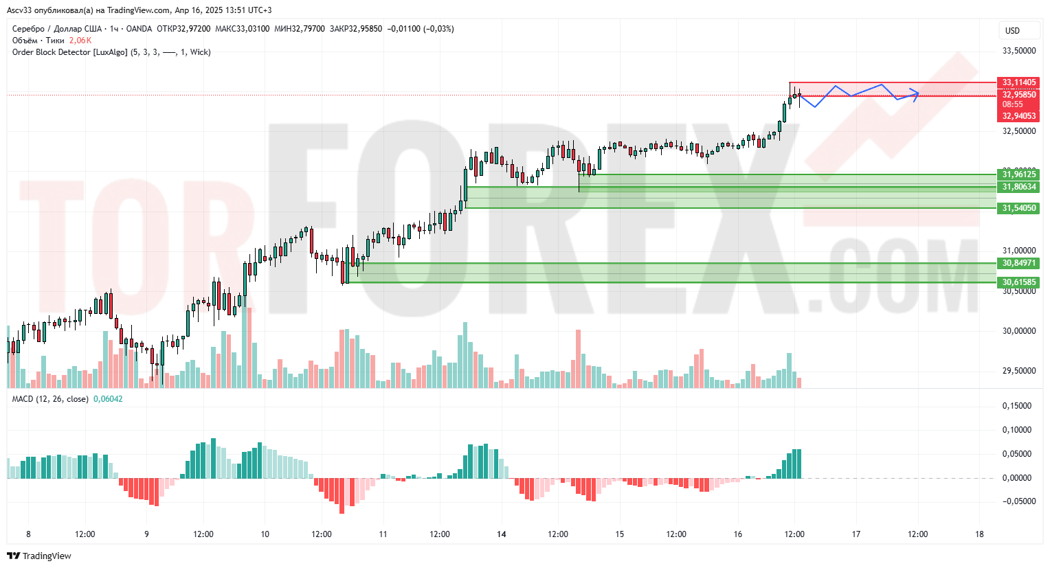 При текущем уровне вероятен флэт перед новым импульсом вверх. Устойчивый рост возможен только при пробое 33.11 и закреплении выше 34.00.