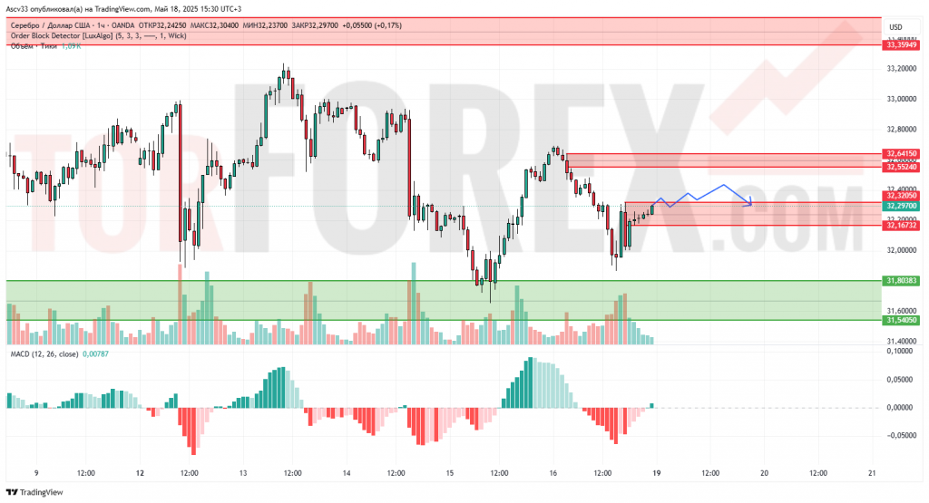 Ожидается, что в ближайшее время XAG/USD будет консолидироваться в диапазоне 32,00–32,50. При пробое ниже 32,00 возможен откат к 31,80. Для продолжения роста необходимо преодоление 32,55 на повышенном объёме. Пока рынок выглядит уязвимым к коррекции.