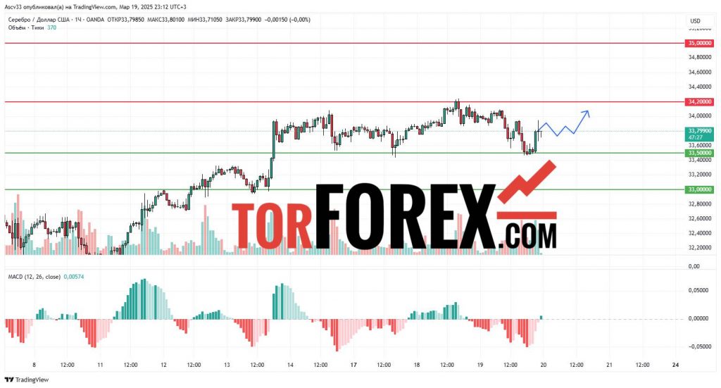 • 34,20 USD – пробой этого уровня может усилить бычий тренд и привести к дальнейшему росту к 35,00 USD.