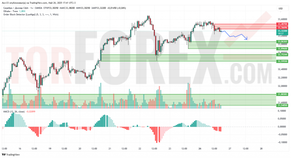 Ожидается продолжение нисходящей коррекции пары XAG/USD в сторону уровней поддержки 33,065 и далее к 32,890. Для возобновления роста цене необходимо преодолеть уровень сопротивления 33,486 и закрепиться выше него.