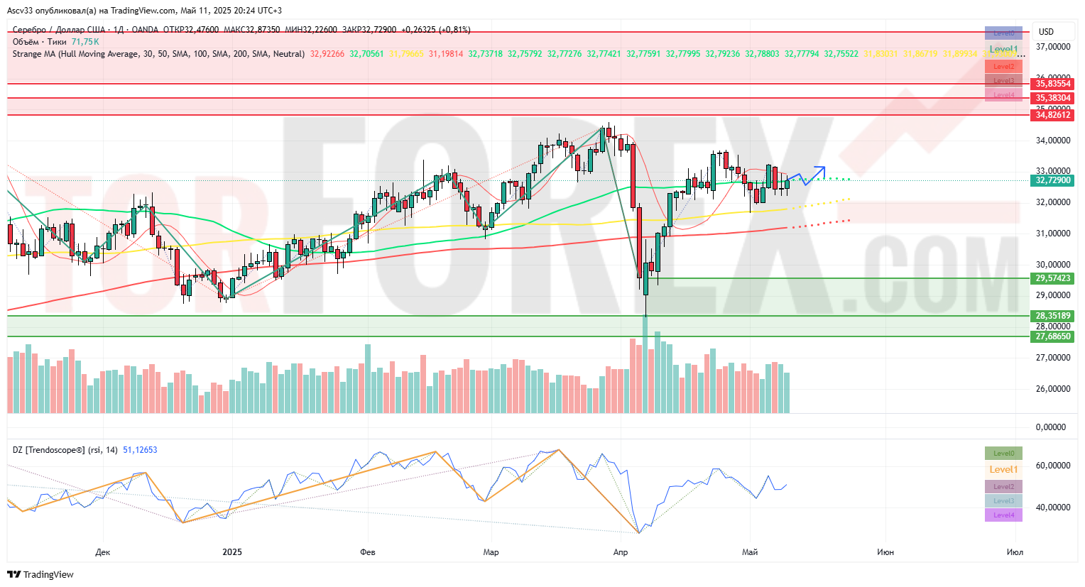 Торговая пара XAG/USD сохраняет умеренно бычий настрой, удерживаясь выше ключевой зоны поддержки вблизи 32,20–32,30 долларов за унцию. После волатильной коррекции в апреле, серебро входит в фазу боковой консолидации с потенциалом продолжения восходящего движения.
