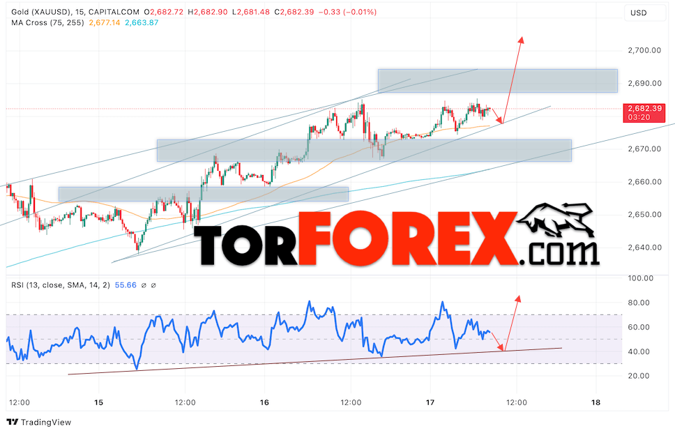 Котировки XAUUSD продолжают движение в рамках развития роста и бычьего канала коррекции. В момент публикации прогноза цена Золота на сегодня составляет 2682 Долларов за Тройскую Унцию. Скользящие средние указывают на наличие краткосрочной медвежьей тенденции. Цены пробили область между сигнальными линиями вверх, что указывает на давление со стороны покупателей актива Золота и потенциальное продолжение роста уже с текущих уровней. На данный момент стоит ожидать попытку развития медвежьей коррекции и тест уровня поддержки вблизи области 2675. Откуда стоит ожидать отскок вниз и продолжение роста цены на Золото с потенциальной целью выше уровня 2715.