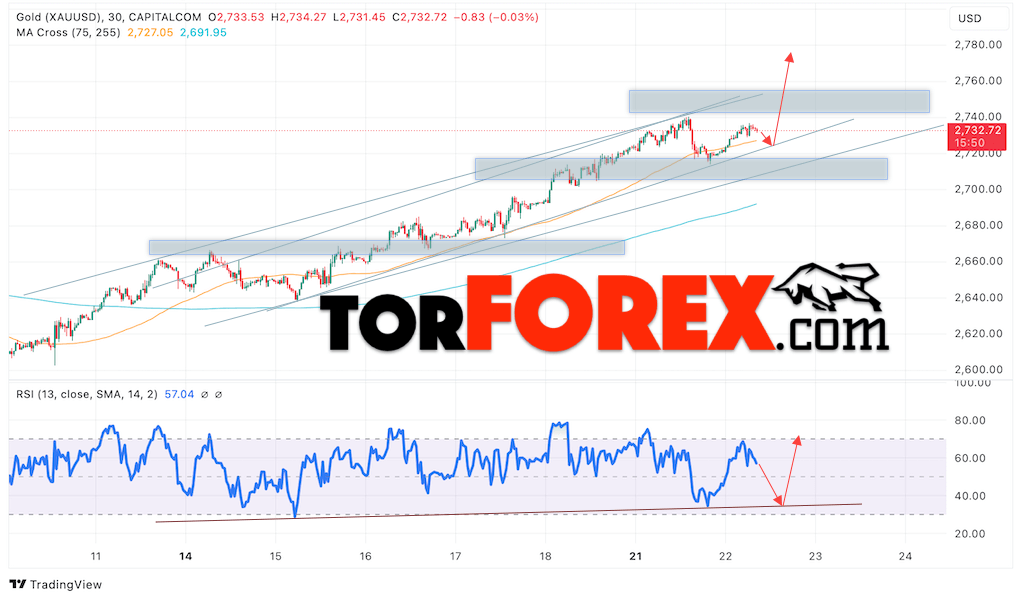 Котировки XAUUSD продолжают движение в рамках развития роста и бычьего канала коррекции. В момент публикации прогноза цена Золота на сегодня составляет 2732 Долларов за Тройскую Унцию. Скользящие средние указывают на наличие краткосрочной медвежьей тенденции. Цены пробили область между сигнальными линиями вверх, что указывает на давление со стороны покупателей актива Золота и потенциальное продолжение роста уже с текущих уровней. На данный момент стоит ожидать попытку развития медвежьей коррекции и тест уровня поддержки вблизи области 2725. Откуда стоит ожидать отскок вниз и продолжение роста цены на Золото с потенциальной целью выше уровня 2785.